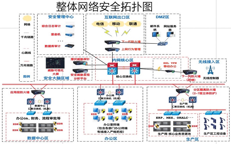安全域劃分:集團網(wǎng)絡(luò)劃分成辦公網(wǎng)、研發(fā)網(wǎng)、生產(chǎn)網(wǎng),數(shù)據(jù)中心網(wǎng),通過下一代防火墻實現(xiàn)網(wǎng)絡(luò)的邏輯隔離和安全防護。