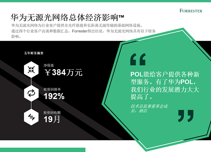 2022年上半年,華為委托權(quán)威咨詢公司Forrester進(jìn)行了《華為無源光網(wǎng)絡(luò)總體經(jīng)濟(jì)影響™》研究。在本研究中,F(xiàn)orrester通過客戶訪談,以專有方法論分析部署華為無源光網(wǎng)絡(luò)(Passive optical LAN,POL)方案對(duì)企業(yè)帶來的經(jīng)濟(jì)影響。研究結(jié)果顯示,企業(yè)使用華為POL五年投資回報(bào)率達(dá)192%,投資回報(bào)周期為19個(gè)月。