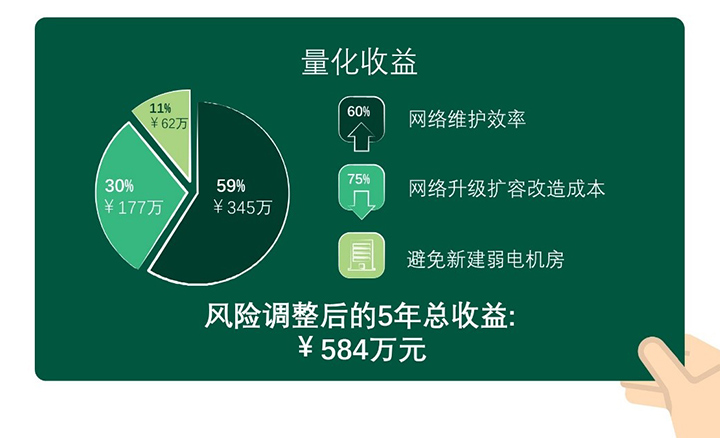 擴(kuò)容建設(shè)投資:網(wǎng)絡(luò)升級(jí)擴(kuò)容基于POL簡(jiǎn)架構(gòu)、光纖輕便靈活可以節(jié)約75%建設(shè)投資,五年總收益現(xiàn)值超177萬元人民幣。