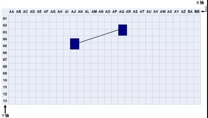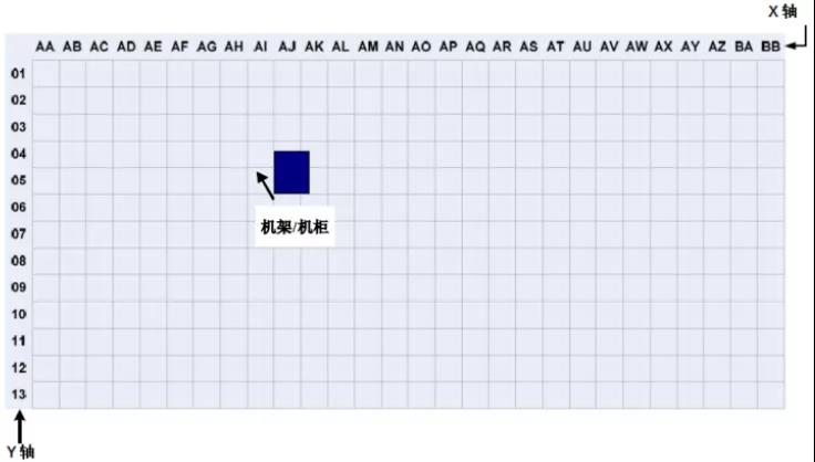 在數(shù)據(jù)中心,機(jī)柜和機(jī)架的位置和布局可以根據(jù)活動(dòng)地板的劃分進(jìn)行組織和標(biāo)記。根據(jù)ANSI/TIA/EIA-606-A標(biāo)準(zhǔn),數(shù)據(jù)室應(yīng)使用兩個(gè)或兩個(gè)字母,每個(gè)600mm*600mm活動(dòng)地板用阿拉伯?dāng)?shù)字標(biāo)識(shí)。在數(shù)據(jù)中心機(jī)房平面圖上建立X、Y坐標(biāo)系的網(wǎng)格,用字母標(biāo)記X軸,用數(shù)字標(biāo)記Y軸,建立坐標(biāo)原點(diǎn)。機(jī)架和機(jī)柜的位置基于它們?cè)诰W(wǎng)格地圖上的正面坐標(biāo)。標(biāo)注如下圖 2所示