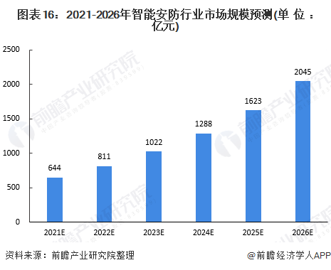 經(jīng)過多年的高速發(fā)展,安防已經(jīng)發(fā)展成為一個龐大的產(chǎn)業(yè)。在經(jīng)歷了數(shù)字化、網(wǎng)絡(luò)化發(fā)展后,安防行業(yè)未來將向智能化深度發(fā)展,智能安防市場規(guī)模也將持續(xù)增長,2013-2020年,我國智能安防市場規(guī)模的年復(fù)合增長率達(dá)26%,據(jù)此增長率,預(yù)計(jì)至2026年,市場規(guī)模有望達(dá)2045億元。