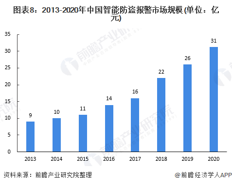 據(jù)中安網(wǎng)數(shù)據(jù)顯示,2020年我國安防行業(yè)總產(chǎn)值8510億元,其中安防產(chǎn)品總產(chǎn)值約為2600億元,結(jié)合防盜報(bào)警系統(tǒng)產(chǎn)值占安防產(chǎn)品總產(chǎn)值12%左右,根據(jù)我國智能防盜報(bào)警系統(tǒng)滲透率在10%左右測算,得出2020年我國智能防盜報(bào)警系統(tǒng)產(chǎn)值約為31億元。
